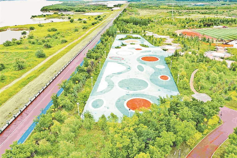 距離體育場(chǎng)不遠(yuǎn),有一處數(shù)千平方米的休閑廣場(chǎng)。廣場(chǎng)周邊新鋪了多條紅色慢行步道,是市民們散步休閑的好去處。在中心區(qū)域,工人們正建設(shè)雕塑,為中外游客打造一處美麗的打卡點(diǎn)。