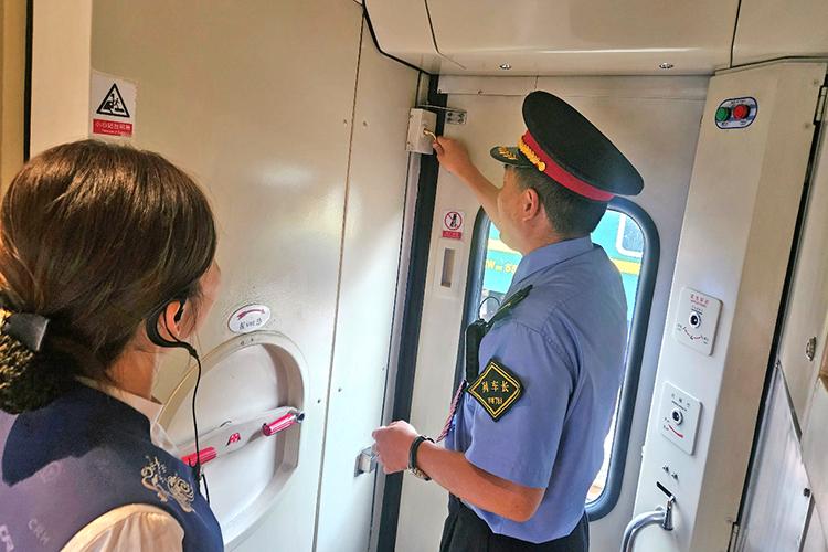 列車長在對車門加鎖情況進行檢查。(韓峰 攝)