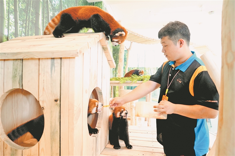 小熊貓是國家二級保護動物,野外種群數(shù)量不足萬只。保育員團隊精心準(zhǔn)備小熊貓的飲食,專門從四川空運新鮮竹子并搭配多種營養(yǎng)餐食,確保小熊貓們健康成長。本報記者 董廣碩攝