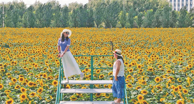 近日,哈爾濱市東方學(xué)院的校園里,30萬(wàn)株向日葵進(jìn)入盛花期,層層疊疊的金黃花瓣在校園里組成金色矩陣,連蜂蝶振翅都沾滿(mǎn)蜜糖色的光斑。風(fēng)掠過(guò)時(shí),葉片翻卷出翡翠色的浪涌,花盤(pán)碰撞發(fā)出細(xì)雨般的窸窣聲,空氣里浮動(dòng)著類(lèi)似烤面包的溫暖香氣。花海間的小橋上,愛(ài)花的市民在這里打卡拍照,定格最美瞬間。