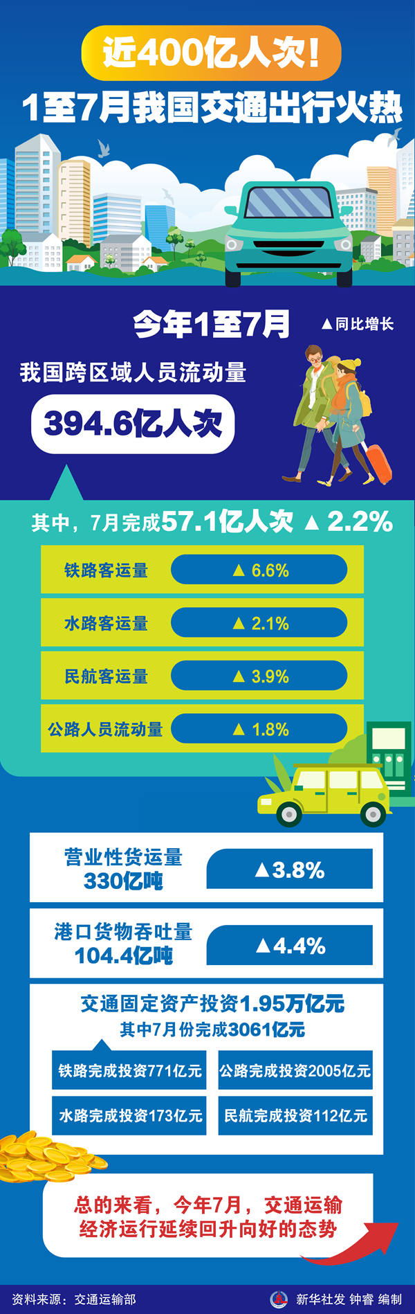 “7月份,完成跨區(qū)域人員流動量57.1億人次,同比增長2.2%,增速較上月回升0.7個(gè)百分點(diǎn)。分方式看,鐵路、水路、民航客運(yùn)量同比分別增長6.6%、2.1%和3.9%,公路人員流動量同比增長1.8%。”交通運(yùn)輸部新聞發(fā)言人李穎說。