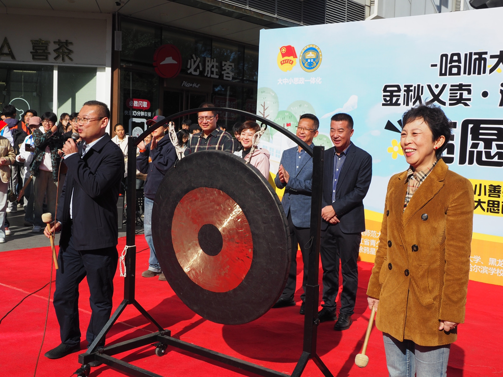 受贈(zèng)方香坊區(qū)幸福鎮(zhèn)哈藥希望小學(xué)校長(zhǎng)劉壯現(xiàn)場(chǎng)介紹了這所希望小學(xué)留守兒童的情況。開幕式最后,黃磊理事長(zhǎng)和張靜萍書記一同敲響大鑼,鳴鑼開市。