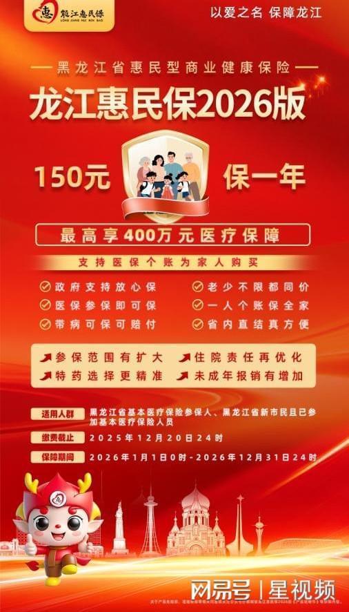 “龍江惠民保2026版”參保通道僅剩最后五天,將于2025年12月20日24時(shí)正式關(guān)閉。凡黑龍江省基本醫(yī)保參保人,只需通過“龍江惠民?!蔽⑿殴娞?hào)即可參保,每人每年150元,最高享400萬元醫(yī)療保障。