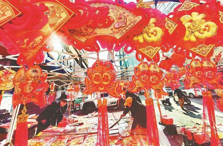 13日,哈爾濱市道外區(qū)大水晶街附近的集市上,許多市民在購買年貨。集市上,各種商品琳瑯滿目,應(yīng)有盡有。紅燈籠、“?!弊?、對(duì)聯(lián)烘托出濃濃的喜慶氣氛。人們臉上都洋溢著幸福的笑容,個(gè)個(gè)滿載而歸。