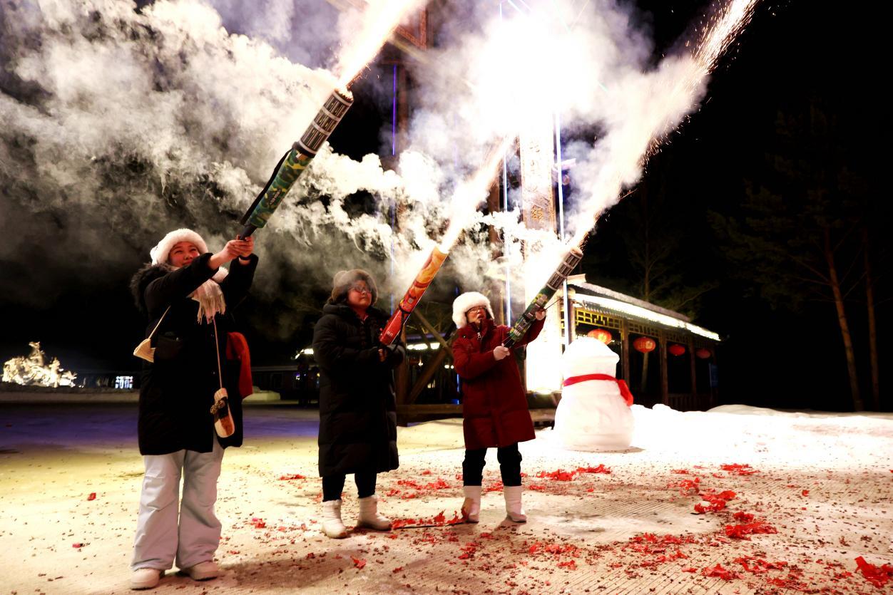 夜幕降臨,龍河驛站燈火璀璨。游客們圍站在一起,揉面團、搟面皮、包餃子,歡聲笑語不斷。熱氣騰騰的團圓飯上桌,大家舉杯同慶高歌,共賀新春。篝火點燃,煙花綻放,清脆的鞭炮聲響徹雪野,大人孩子盡情歡跳、嬉戲,雪地成了歡樂的海洋,笑聲、歡呼聲與冰雪美景相融,繪就一幅溫暖喜慶的新春畫卷。