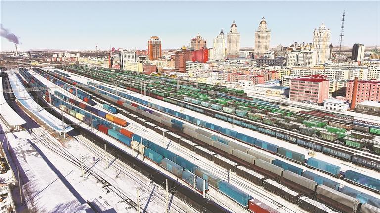 中歐班列在中國(guó)鐵路哈爾濱局集團(tuán)有限公司滿洲里站內(nèi)等待出境發(fā)車(chē)。黃旭攝