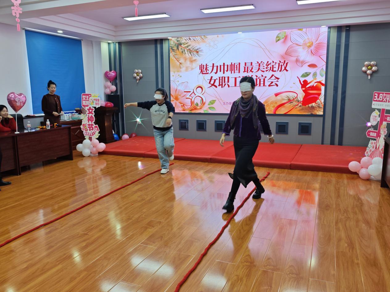 互動游戲環(huán)節(jié)同樣妙趣橫生,“桃花朵朵開”“漏框接氣球”“蒙眼走繩子”“蒙眼喝飲料”等趣味項目,讓女職工們暫時卸下工作壓力,在比拼中增進情誼,在歡聲笑語中放松身心?,F(xiàn)場加油聲、喝彩聲此起彼伏,持續(xù)將活動氛圍推向高潮。