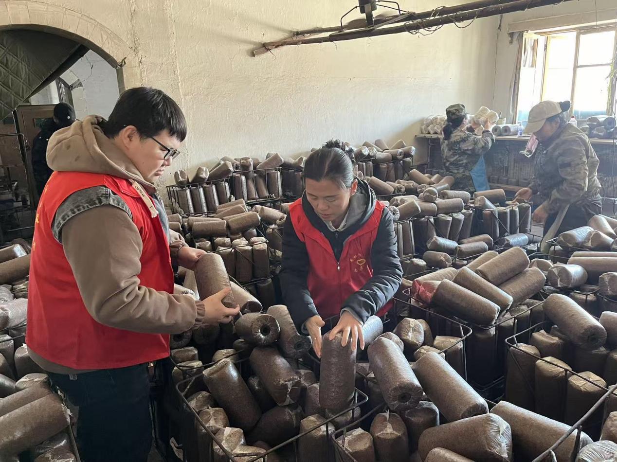 林場(chǎng)志愿者正在搬運(yùn)木耳菌袋(趙可心 攝)